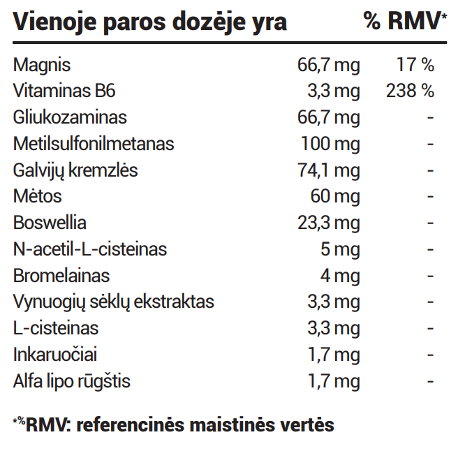 Gliukozamino hidrochloridas (krabai ir krevetės (vėžiagyviai), rūgštis (obuolių rūgštis), magnio oksidas, dengiamoji medžiaga (želatina), metilsulfonilmetanas, karvių kremzlių milteliai, pipirmėčių (Mentha x piperita) lapų milteliai, Boswellia serrata dervos ekstraktas, vanduo, lipnumą mažinanti medžiaga (stearino rūgštis), pipirmėtės (Mentha x piperita), N-acetil-L-cisteinas, pipirmėčių kvapioji medžiaga, piridoksino hidrochloridas, bromelainas, vynuogių (Vitis vinifera) sėklų ekstraktas, L-cisteinas, inkaruočių (Harpagophytum procumbens) šaknų ekstraktas, alfa lipo rūgštis ir lipnumą mažinanti medžiaga (silicio dioksidas).