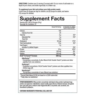 Išrūgų baltymų koncentratas (pienas, sojos), hidrolizuoti išrūgų baltymai (pienas), maltodekstrinas, hidrolizuoti kiaušinių baltymai, kvapioji medžiaga, „4Life Tri-Factor™ Formula“ (pagaminta iš krekenų (pieno) ir kiaušinių trynių miltelių), vidutinės grandinės trigliceridų aliejaus milteliai, tirštiklis (ksantano derva), natrio chloridas, tirštiklis (celiuliozės derva), saldikliai (sukralozė, acesulfamas K).