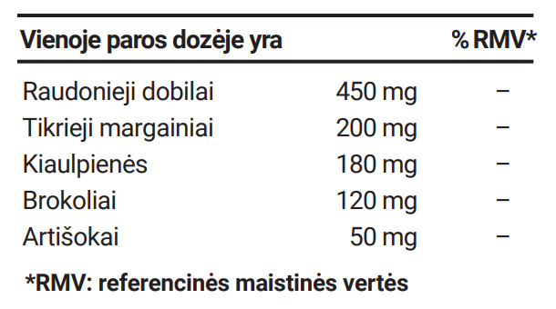 Raudonųjų dobilų (Trifolium pratense L.) žiedų milteliai, margainių (Silybum marianum) vaisių ekstraktas, želatina, kiaulpienių (Taraxacum officinale) lapų ekstraktas, brokolių (Brassica oleracea L. var. italica Plenck) sėklų ir lapų ekstraktas, artišokų (Cynara scolymus L.) lapų ekstraktas, ir rapsų aliejus.