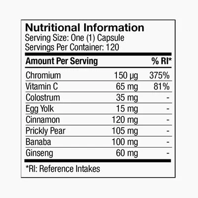 Cinamonas (Cinnamomum zeylanicum), opuncija (Opuntia ficus-indica), banaba (Lagerstroemia speciosa), želatina, L-askorbo rūgštis, ženšenis (Panax ginseng), „4Life Transfer Factor“ (pagaminta iš karvių krekenų (pieno) ir kiaušinių trynio), vanduo, chromo chloridas (III).