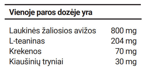 laukinių žaliųjų avižų (Avena sativa L.) augalų ekstraktas, L-teaninas, dengiamoji medžiaga (hidroksipropilmetilceliuliozė), junginys „4Life Tri-Factor™ Formula“ (pagamintas iš krekenų (pieno) ir kiaušinių trynių), lipnumą reguliuojanti medžiaga (magnio stearatas), vanduo ir lipnumą reguliuojanti medžiaga (silicio dioksidas).