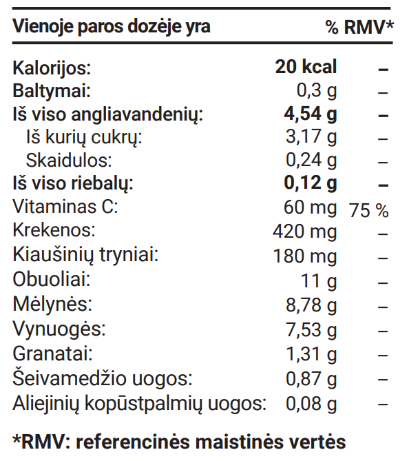 - Neviršykite rekomenduojamos dienos dozes. Šis produktą negali būti laikomas įvairiapuses ir subalansuotos dietos bei sveikos gyvensenos pakaitalu. Laikykite mažiems vaikams nepasiekiamoje vietoje.