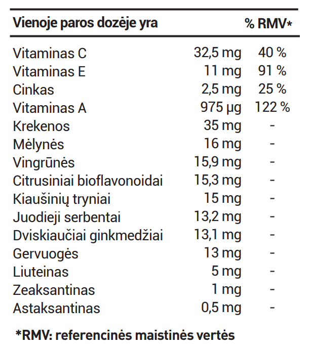 - Mėlynių ekstraktas ir ginkmedžių lapų ekstraktas prisideda prie normalios akies kraujotakos.